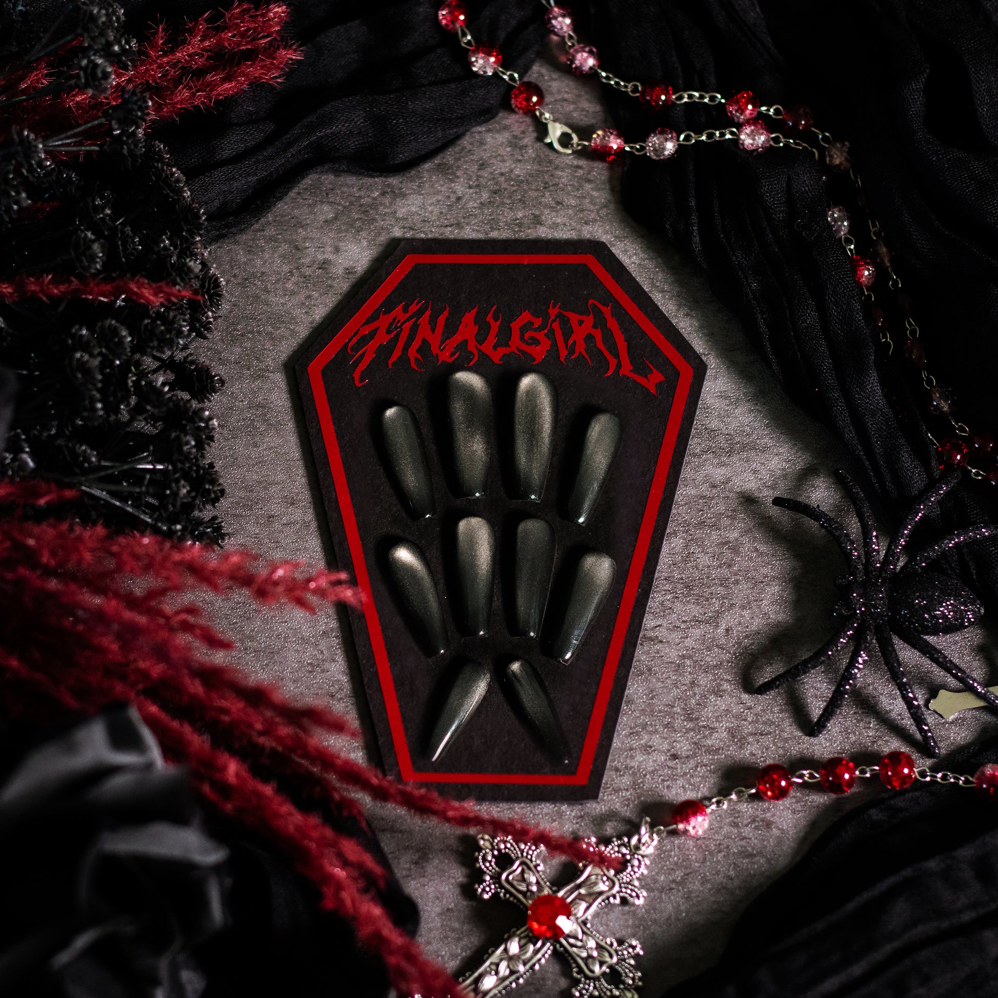 EMBRACE THE SHADOWS WITH THESE BLACK CAT EYE NAILS THAT SHIFT UNDER THE LIGHT, JUST LIKE A GHOSTLY SPIRIT. THIS SET IS PERFECT FOR ADDING A TOUCH OF DARK, GOTHIC ALLURE TO YOUR LOOK.