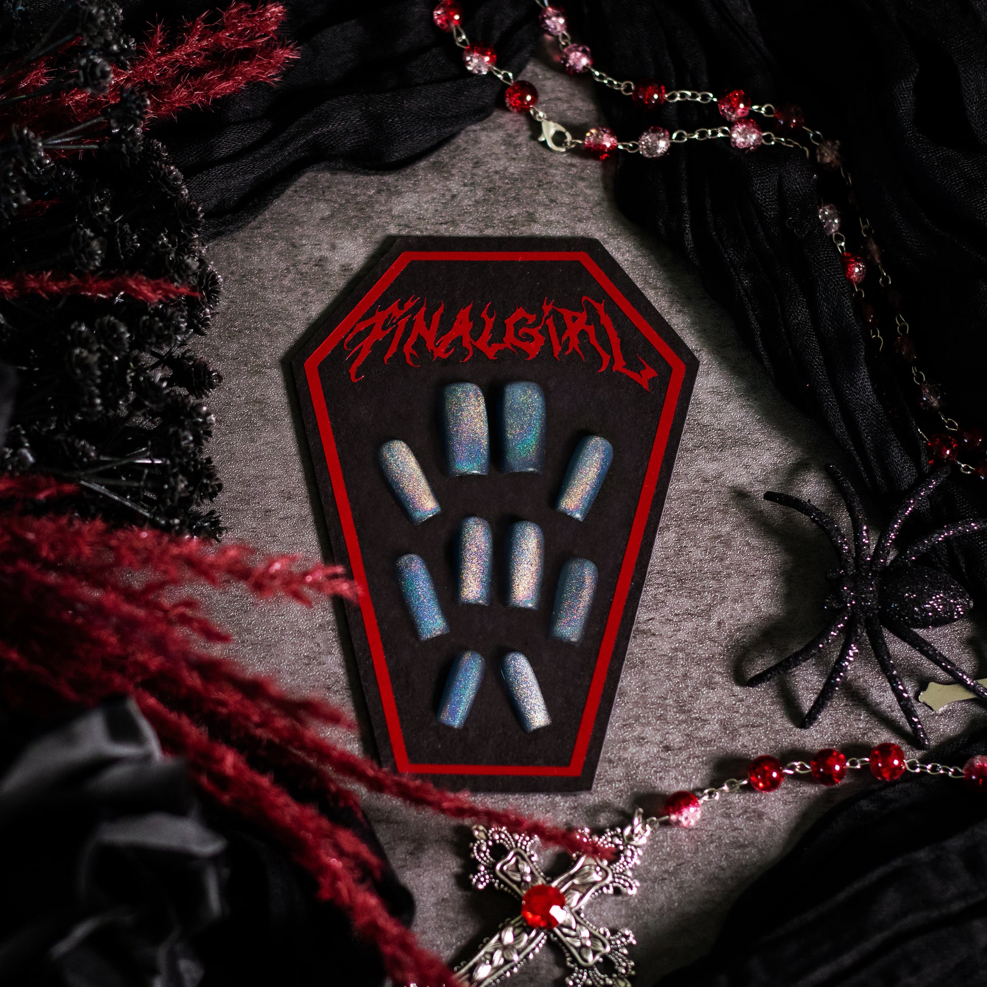 EMBRACE COSMIC BEAUTY WITH THIS SET. THESE NAILS FEATURE A BLUE CAT EYE BASE TOPPED WITH A RAINBOW CAT EYE LAYER THAT SHIFT IN ALL DIRECTIONS UNDER THE LIGHT. THIS SET IS PERFECT FOR THOSE WHO FIND BEAUTY IN THE COSMOS.