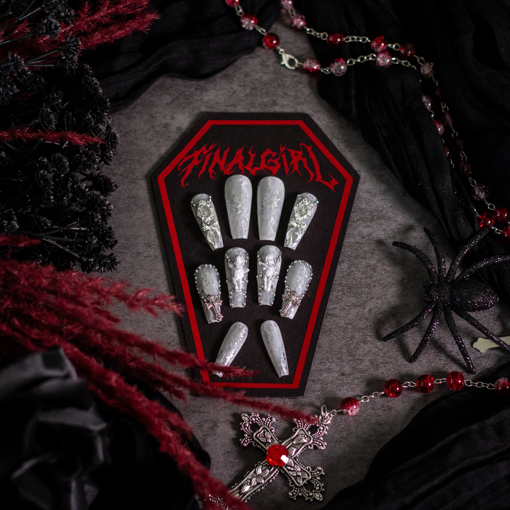 THIS SET EXUDES CELESTIAL BEAUTY AND OTHERWORLDLY CHARM THROUGH THE SILVER, WHITE MARBLE BASES, COMPLEMENTED BY 3D CHERUB CHARMS, SILVER BEADWORK, AND SILVER CHARMS. THIS DREAMY, ANGELIC SET FEELS AS IF IT WAS CRAFTED BY SPIRITS FROM ANOTHER REALM.