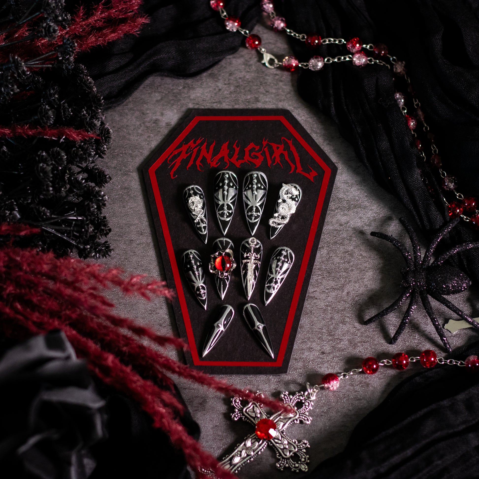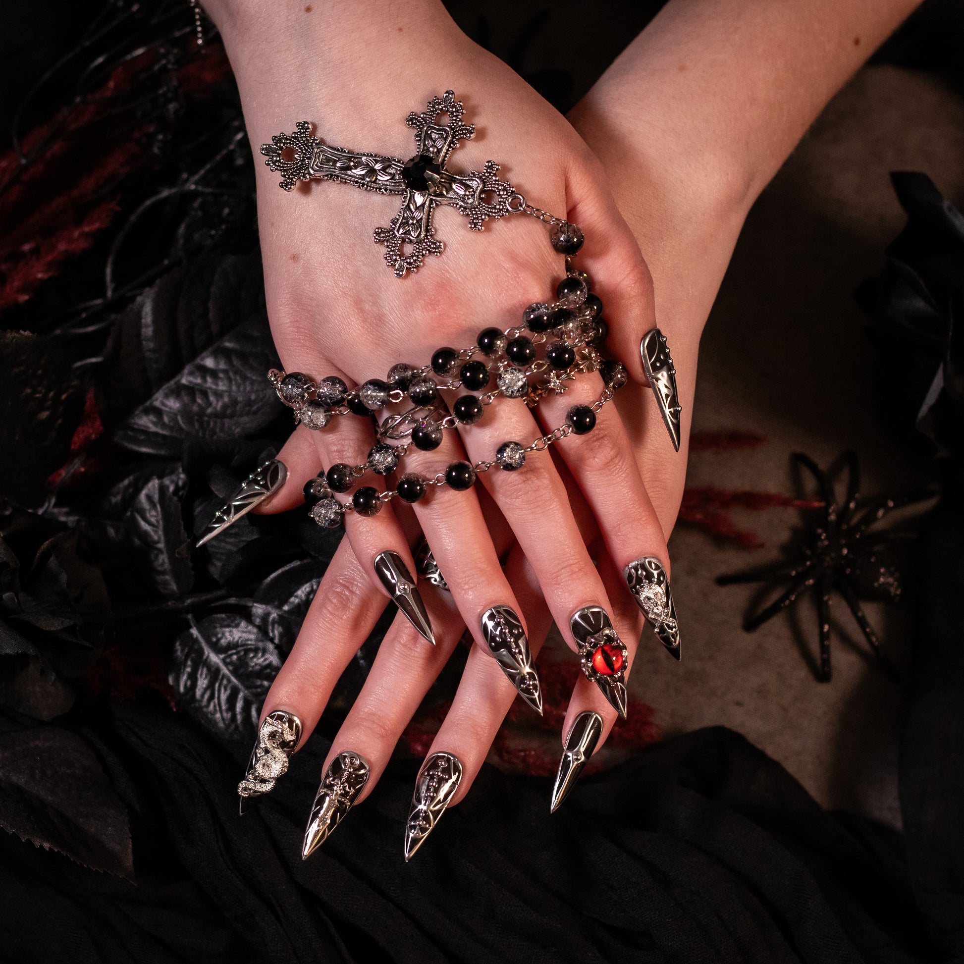 THESE NAILS ARE FIT FOR A TARGARYEN. THEY ARE A FIERCE EMBODIMENT OF POWER, MYSTERY, AND MEDIEVAL FANTASY. THIS SET FEATURES A SHEER BLACK BASE WITH CHROME LINEWORK THAT IS DECORATED WITH A SILVER SWORD, RED DRAGON EYE, SILVER DRAGON, AND SILVER SKULL AND BONES. THIS SET COMMANDS ATTENTION, EMBODYING THE UNTAMED SPIRIT OF A DRAGON QUEEN.