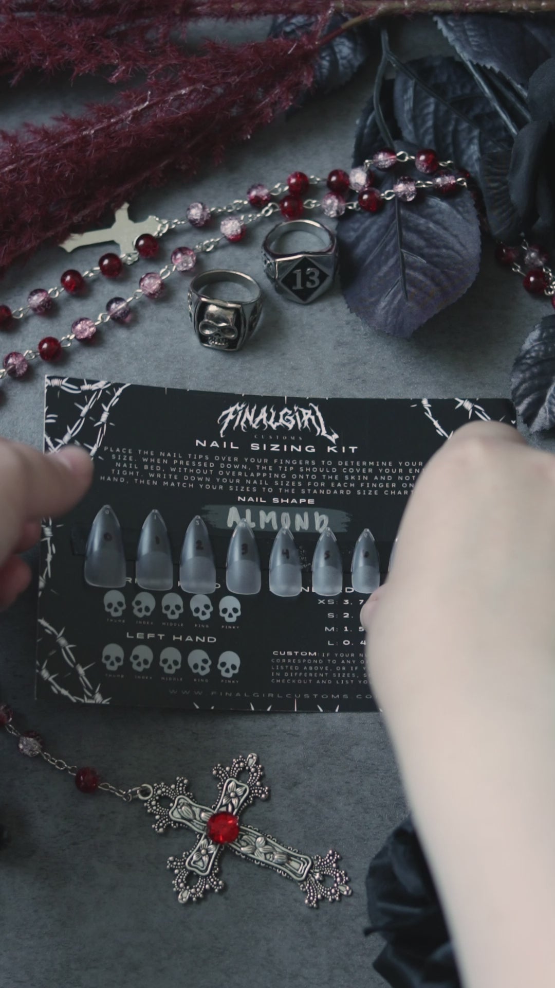 - IF YOU NEED A CUSTOM SIZE, SELECT THE ‘CUSTOM’ OPTION UNDER THE NAIL SIZE DROP-DOWN MENU. TYPE YOUR SIZING KIT NUMBERS IN THE TEXT BOX IN THIS ORDER: THUMB, INDEX, MIDDLE, RING, PINKY. IF YOUR LEFT AND RIGHT HANDS HAVE DIFFERENT SIZES, TYPE THE TWO HAND SIZES IN THE TEXT BOX.