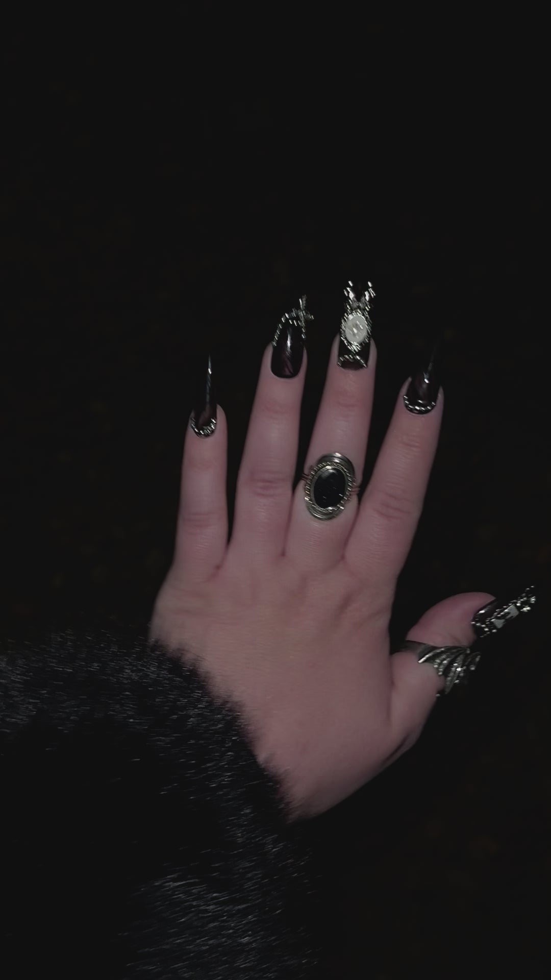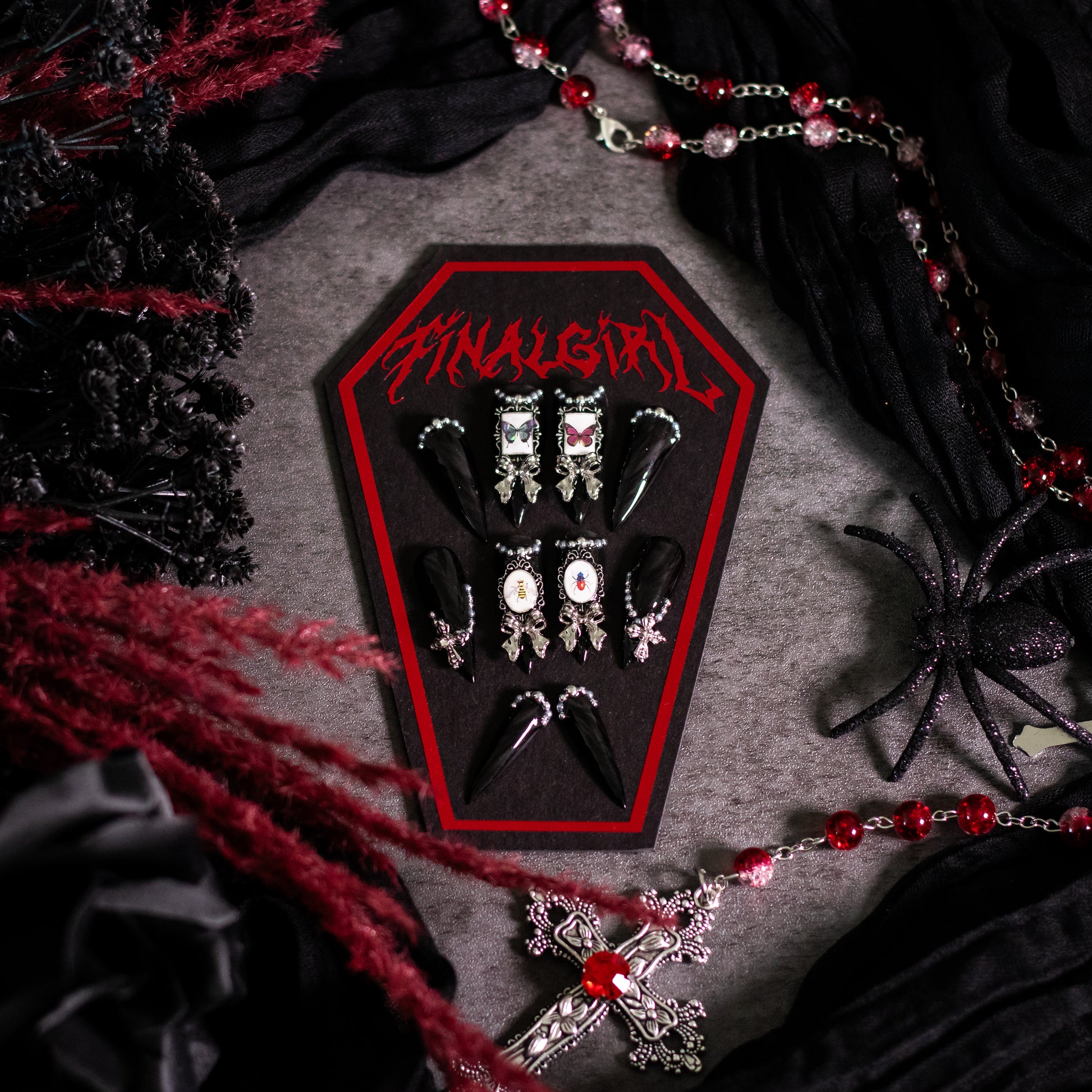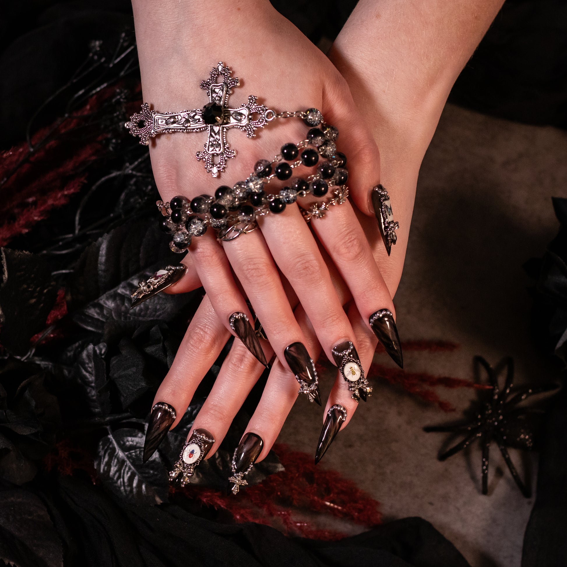 THESE NAILS ARE THE EPITOME OF DARK GOTHIC LUXURY. THIS SET FEATURES SHEER, MARBLED BLACK BASES DECORATED WITH SILVER BEADWORK, FRAMED BUG ODDITIES, AND SILVER CHARMS. THIS SET IS PERFECT FOR ANYONE DRAWN TO THE STRANGE AND UNUSUAL.