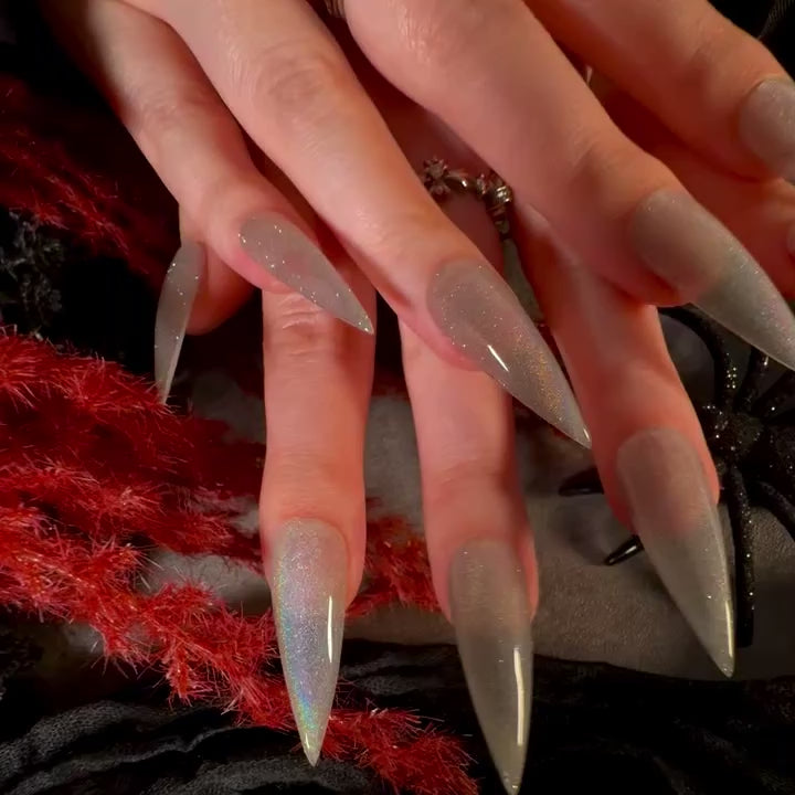 THESE NAILS ARE THE SKIN OF A KILLER. THIS SET FEATURES A SILVER REFLECTIVE GLITTER BASE TOPPED WITH A RAINBOW CAT EYE LAYER. WHEN EXPOSED TO LIGHT, THESE NAILS SHIMMER JUST LIKE A VAMPIRE'S SKIN.