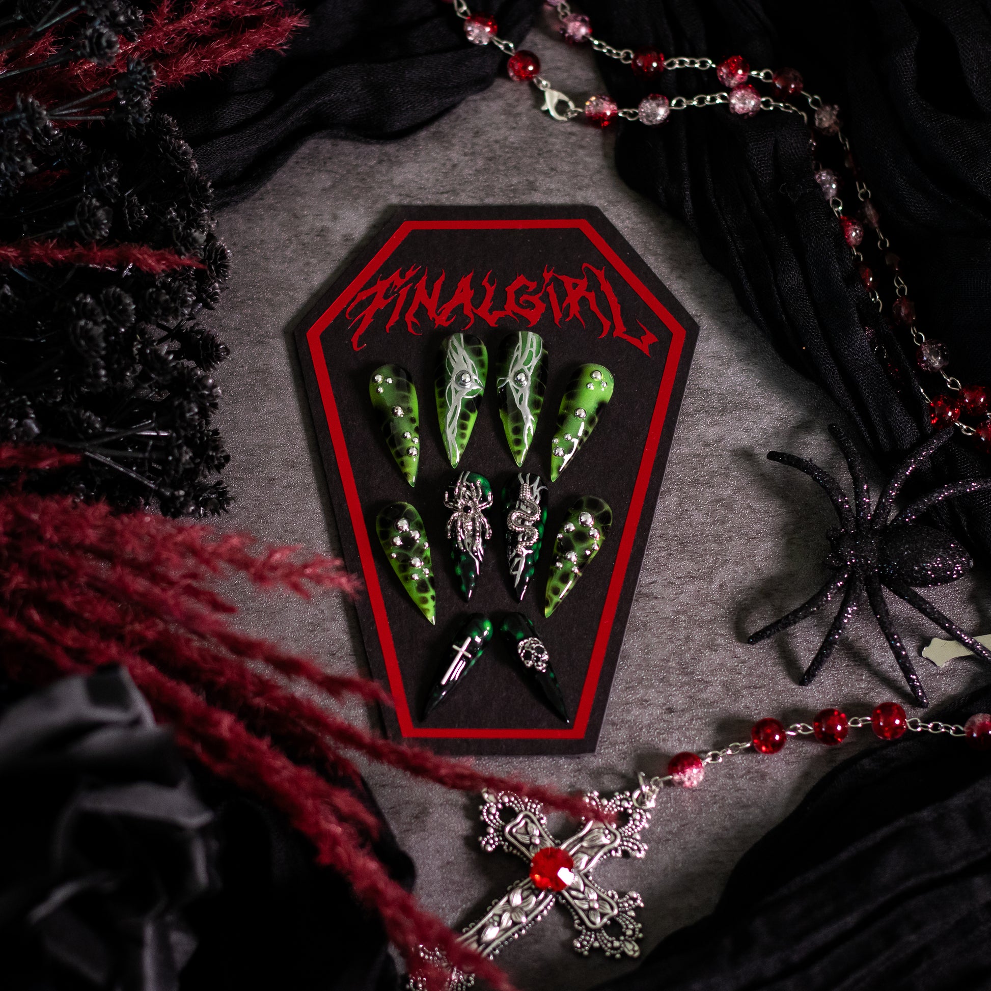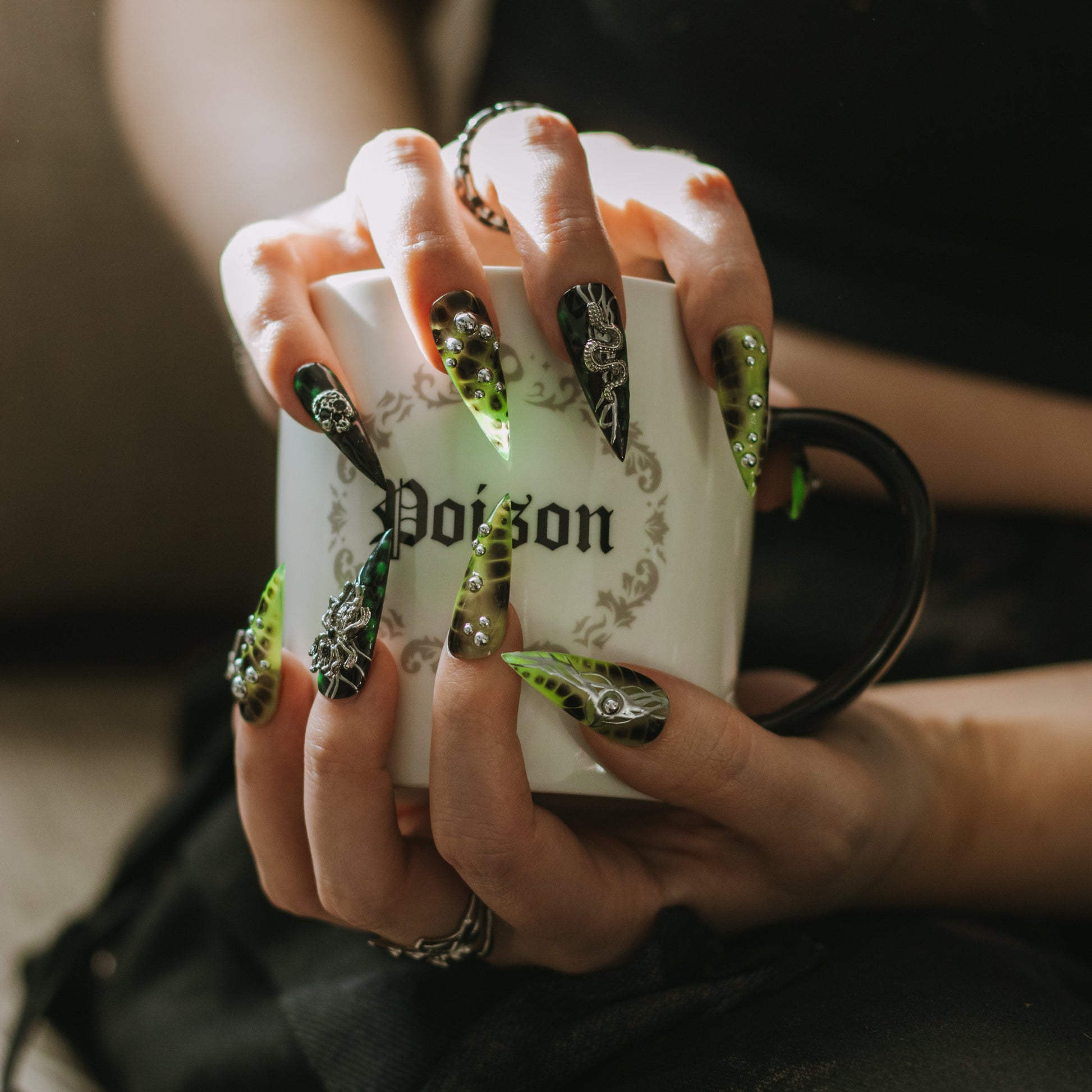 GIVE ME ALL YOUR POISON AND THESE NAILS. THIS SET FEATURES BLACK AND NEON GREEN PATTERNED BASES ADORNED WITH SILVER GOTHIC CHARMS AND BEADWORK. THESE NAILS ARE THE ULTIMATE STATEMENT FOR THOSE WHO EMBRACE THE VENOMOUS AND THE VENGEFUL.