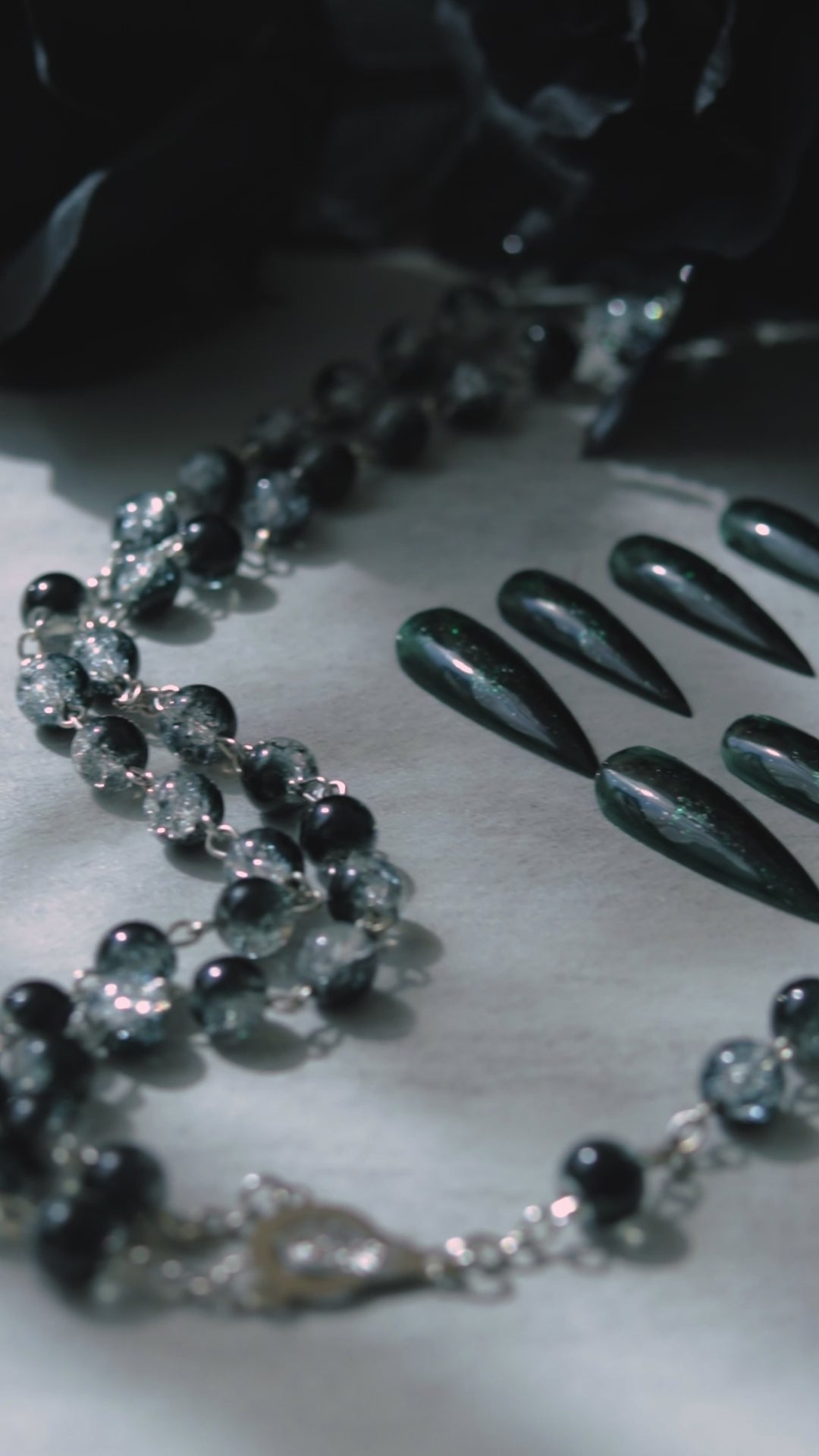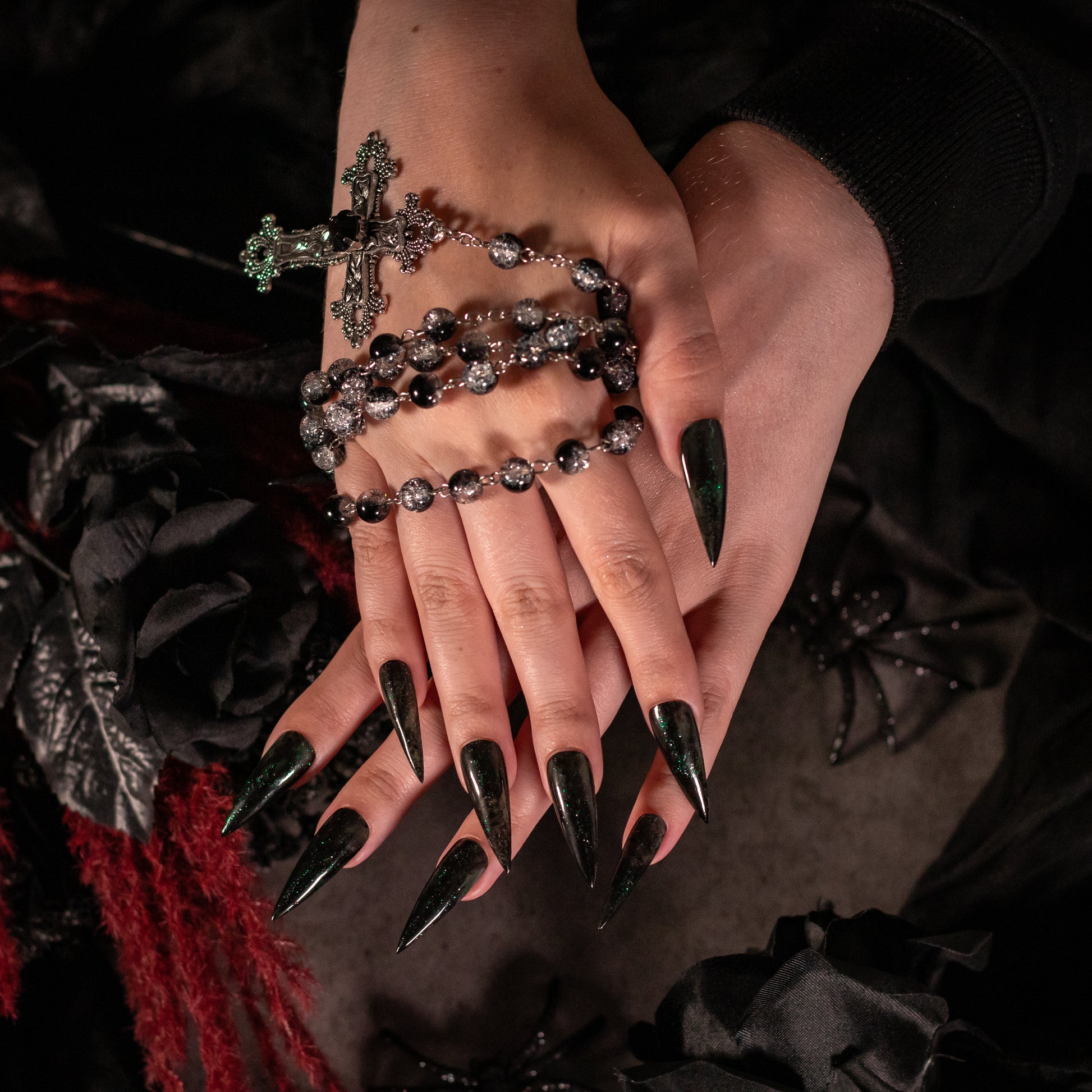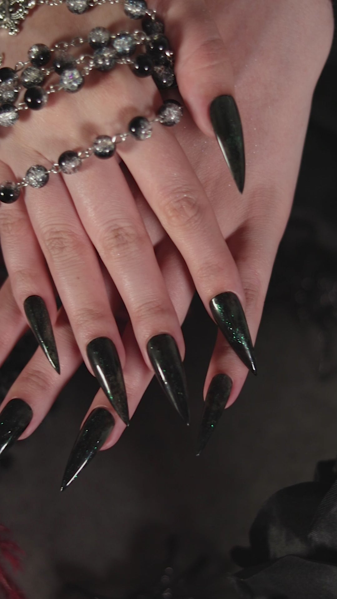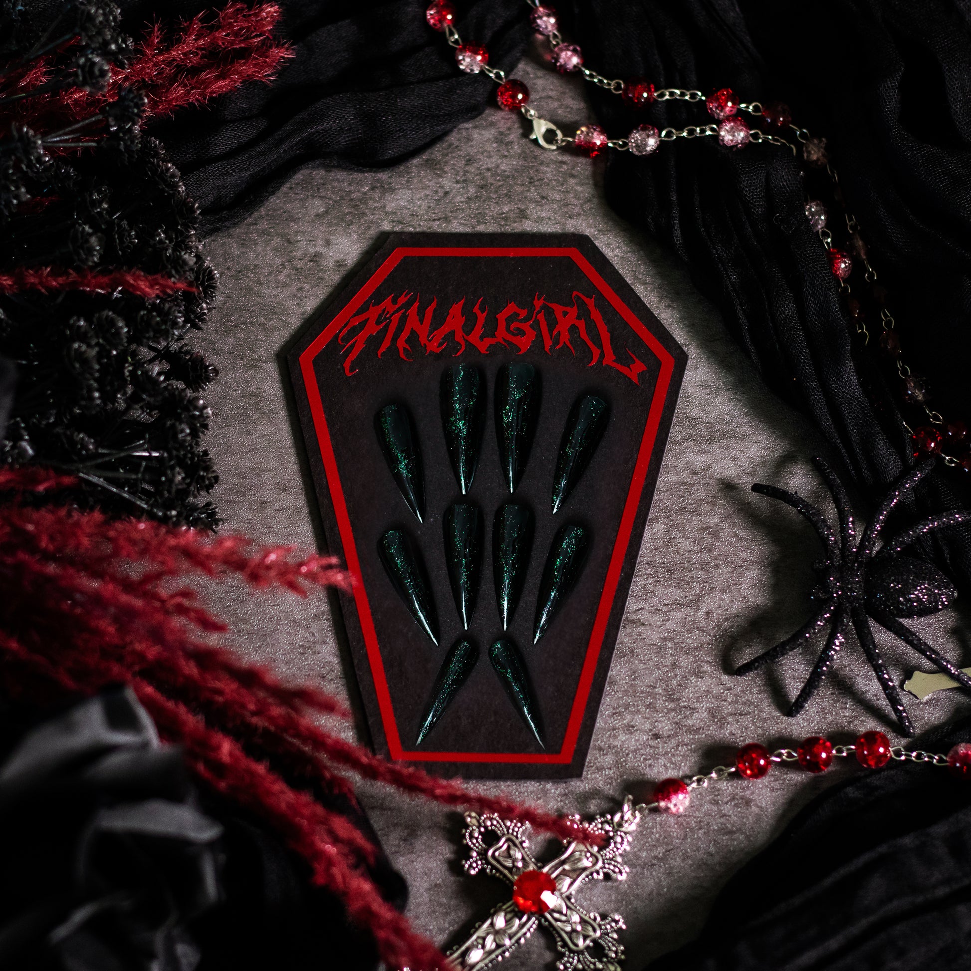 THIS SET IS A TRIBUTE TO THE EERIE BEAUTY OF THE NATURAL WORLD. THESE NAILS ARE MARBLED WITH DEEP EMERALD GREEN AND JET BLACK LAYERS, ACCENTED WITH VEINS OF GREEN SHIMMER.